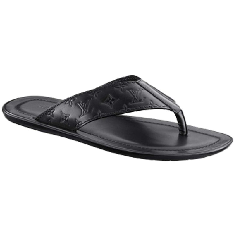 Monogram-embossed calf leather brings a sophisticated feel to this comfortable, laid-back city thong.