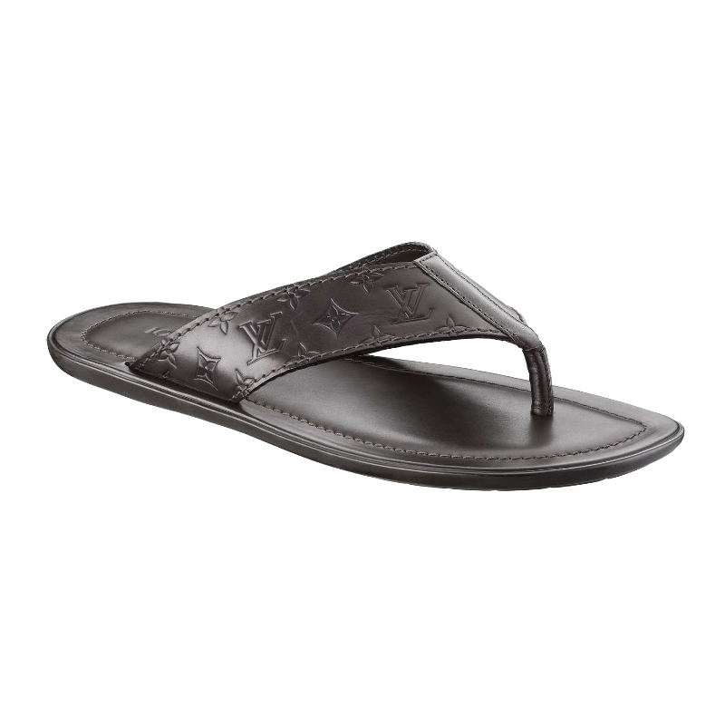 Monogram-embossed calf leather brings a sophisticated feel to this comfortable, laid-back city thong.