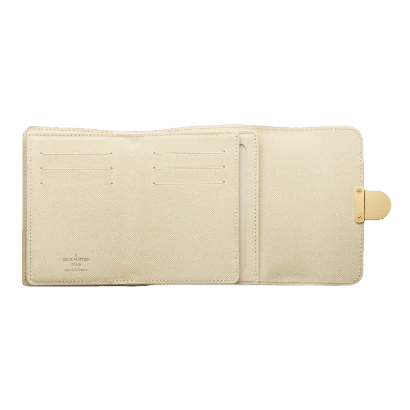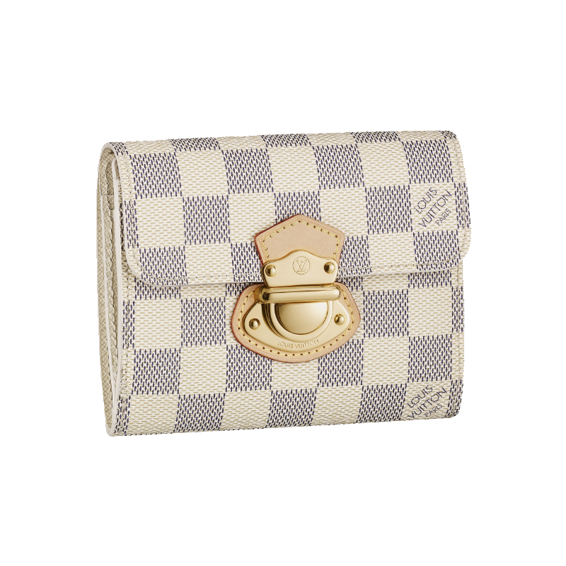 The versatile Joey Wallet in fresh Damier Azur Canvas is ideal for carrying cards, cash and coins. The bold Louis Vuitton engraved tuck-lock and rich golden brass studs add a refined touch.