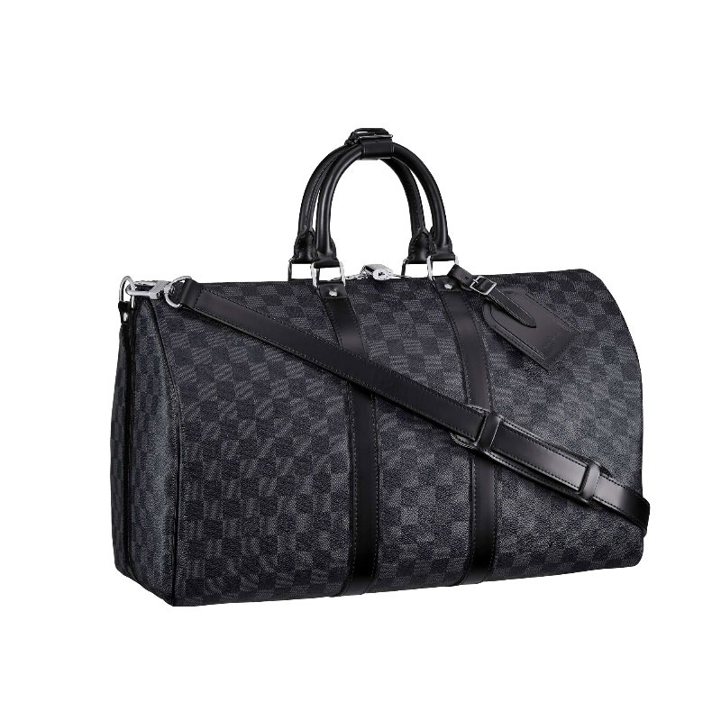 This cabin sized iconic Keepall 45 is made from Damier Graphite canvas. It features rounded leather handles and an adjustable, removable shoulder strap with pad for extra comfort.