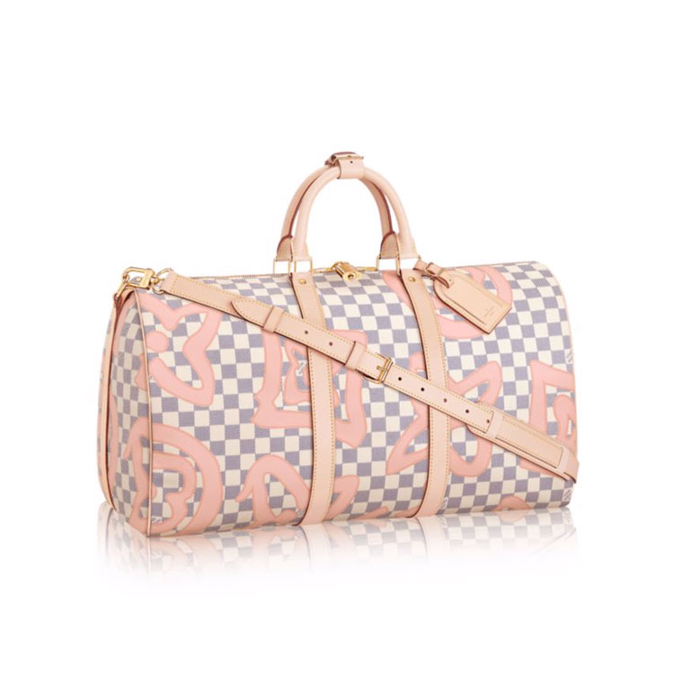 The iconic Keepall holdall is given a fresh, feminine feel for summer in Damier Azur canvas overlaid with a splashy Monogram print adapted from the Louis Vuitton archives.
