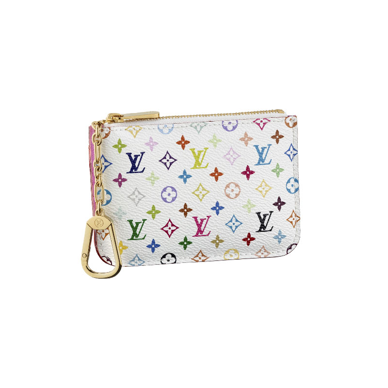 This key and change holder is crafted in Monogram MultiColore canvas designed by Takashi Murakami. It has a golden hook and chain to attach it to the D-ring found in many Louis Vuitton bags.