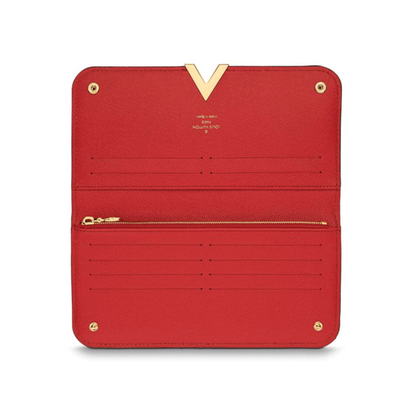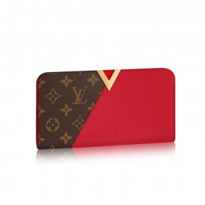 The striking Kimono Wallet combines iconic Monogram canvas and colourful calf leather for a graphic design. The eye-catching golden V signature, inspired by a vintage Louis Vuitton advertising campaign, gives a perfect finish to this feminine wallet.