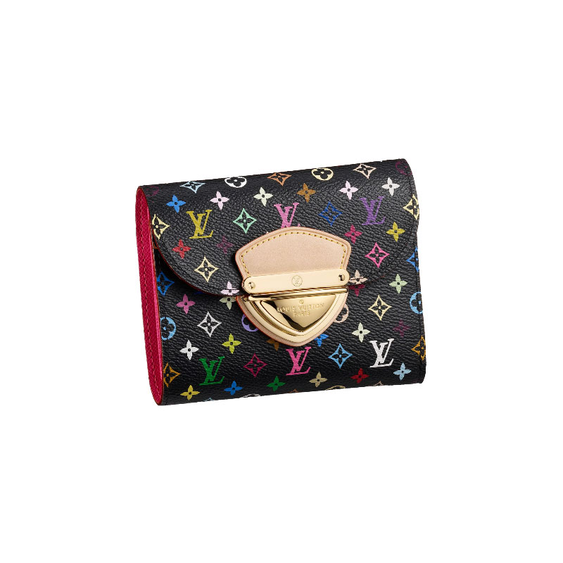 This wallet in Monogram MultiColor canvas created by Takashi Murakami has a press lock closure. It can hold up to 9 credit cards, change, bills and other papers.