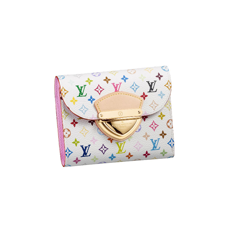 This wallet in Monogram MultiColor canvas created by Takashi Murakami has a press lock closure. It can hold up to 9 credit cards, change, bills and other papers.