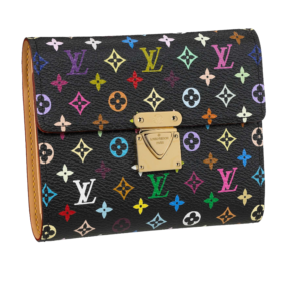 This wallet in Monogram Multicolor canvas created by Takashi Murakami has a press lock closure. It can hold up to 9 credit cards, change, bills and other papers.