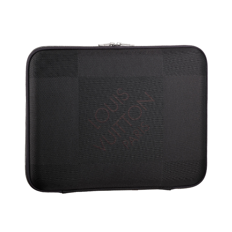 This larger sized, slim laptop sleeve in classic Damier Geant canvas opens flat thanks to a double zipper. The laptop compartment is foam-lined and sports an embossed Louis Vuitton inventeur signature.
