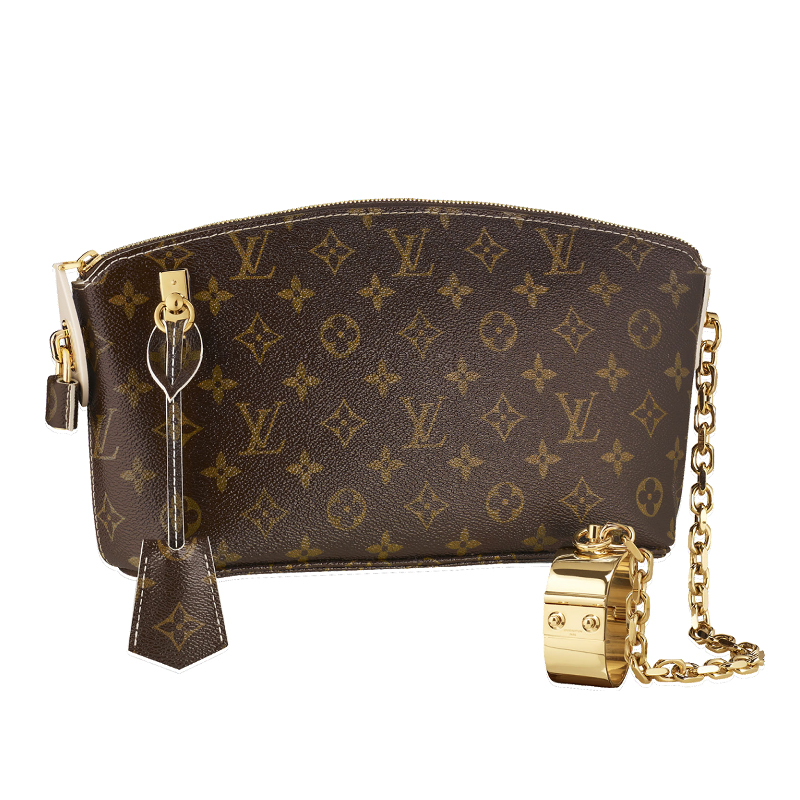 Add a touch of Louis Vuitton glamour with the Lockit Clutch. Glossy Monogram Fetish canvas is elegantly contrasted with a luxurious matt goatskin lining and a bold removable chain and handcuff set.
