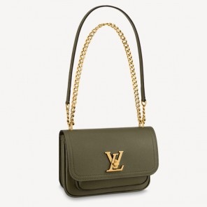The Lockme Chain PM handbag is made from grained calf leather. Its sleek lines are signed with the iconic LV turn lock, reimagined in a stylish facetted design. It offers comfortable shoulder and crossbody carry, thanks to its sliding chain with a long leather shoulder pad. Front and flat back pockets deliver easy access to belongings.