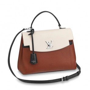 The one-handle Lockme Ever model in soft calfskin sports a sleek, structured shape. The graphic lines of the top flap give this supple, roomy bag a modern attitude. Accented with a silver-finish LV turn lock and furnished with a leather strap for hands-free ease, it is an elegant choice for daily wear.