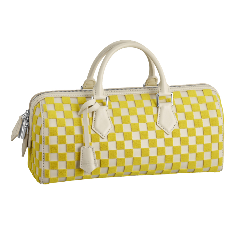 Seen at Louis Vuitton's Spring/Summer 2013 women's fashion show, the Speedy Cube in Damier Cubic reinterprets the iconic Speedy bag in the geometric spirit of the collection. The historic Damier pattern is replicated using the traditional craft of tufting, innovatively applied to embroidered calf leather, to create a 3D flocked finish that is both feminine and eye-catching.