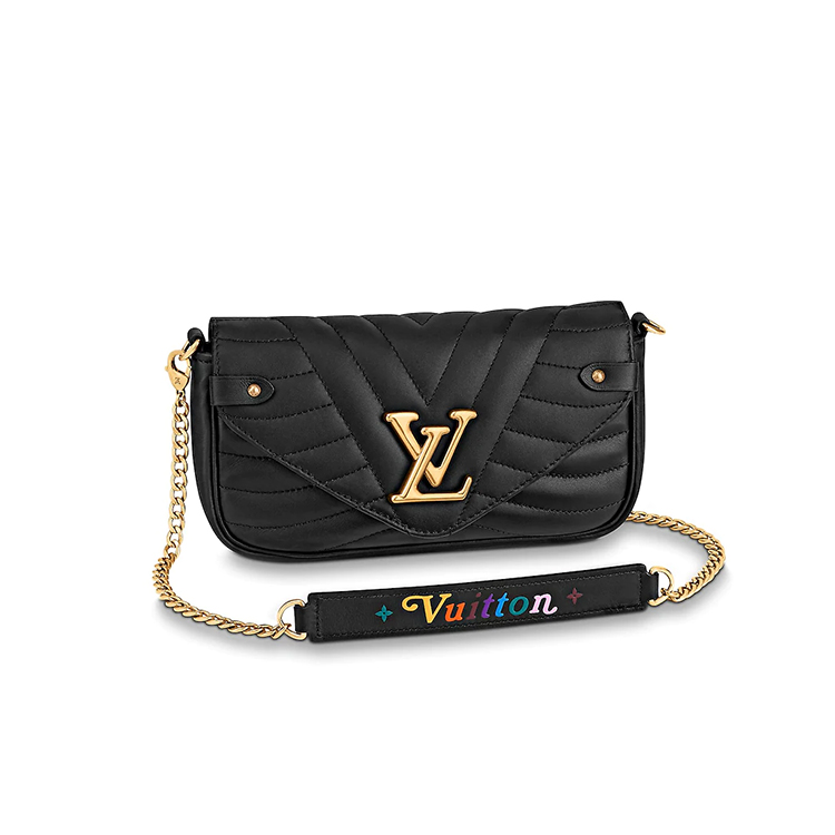 The New Wave chain pochette displays the key signatures of the New Wave line, including smooth calf leather with wave-pattern quilting and a rainbow-colored Louis Vuitton signature on the strap. Fashionable and easy to carry, the wallet is large enough to hold a smartphone, while a zipped pocket protects valuables.