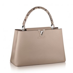 Taking its name from the rue des Capucines in Paris, where Louis Vuitton opened his first store in 1854, the timelessly elegant Capucines bag is a testament to fine leather craftsmanship. In full-grain Taurillon leather, it combines refined details, including a semi-rigid handle secured by jewel-like rings, with a spacious, functional shape offering two inside compartments. Its distinctive flap can be worn in two ways: outside to reveal the outline of a Monogram flower, or inside to show the LV initials.