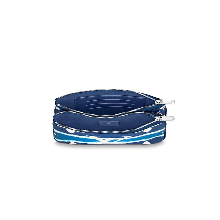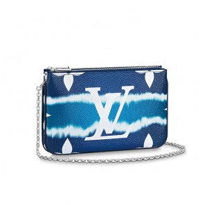 This special edition of the Pochette Double Zip is part of the Summer 2020 LV Escale collection of accessories and leather goods. It comes in Monogram Giant canvas with a tie-dye print in shades of blue inspired by the traditional Japanese Shibori technique. This versatile pouch features several pockets and a removable, silver-tone chain.