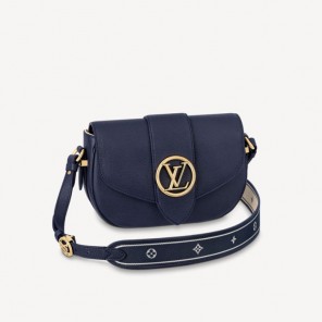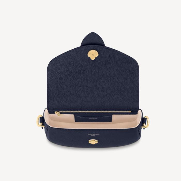 The LV Pont 9 Soft MM is a rounded handbag made from grained calfskin with smooth cowhide lining in a contrasting color and a wide two-color strap decorated with Monogram Flowers. The two sides of the strap are woven separately and then stitched together by hand. The new LV Circle signs this bag.