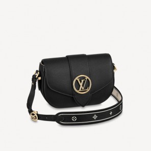 The LV Pont 9 Soft MM is a rounded handbag made from grained calfskin with smooth cowhide lining in a contrasting color and a wide two-color strap decorated with Monogram Flowers. The two sides of the strap are woven separately and then stitched together by hand. The new LV Circle signs this bag.