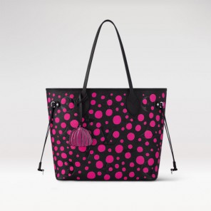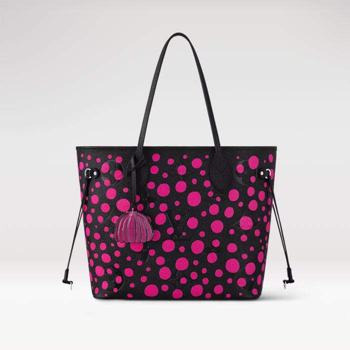 The LVxYK Neverfull MM joins the “Infinity Dots” theme of the major new Louis Vuitton x Yayoi Kusama collection. Endless arrays of dots are the Japanese artist’s ultimate visual signature, featured in her paintings, sculptures and performances since the beginning of her career. For this practical, capacious bag, bright fuchsia dots stand out against black Monogram Empreinte cowhide. And it comes with a pumpkin-shaped charm, echoing another of Kusama’s emblems.