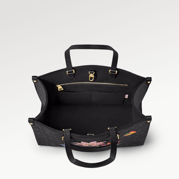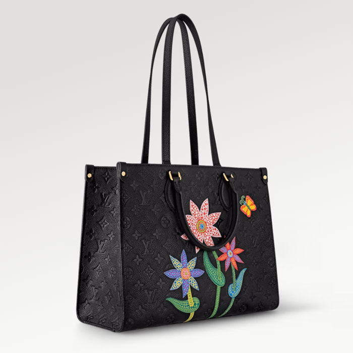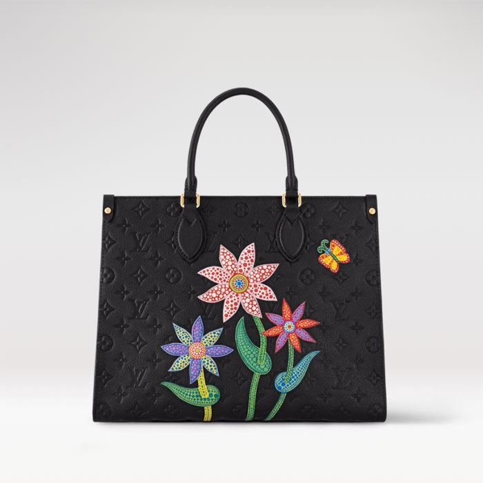 A standout of the Louis Vuitton x Yayoi Kusama collection, this version of the LVxYK OnTheGo MM features a delicate flower pattern inlaid on sumptuous black Monogram Empreinte cowhide. The renowned artist grew up in rural Japan, where her parents ran a plant nursery, and flowers have been a significant theme in her work throughout her career. A capacious, practical bag becomes a masterpiece of artistry and craftsmanship.