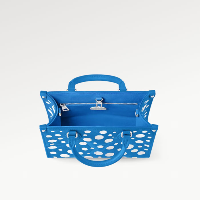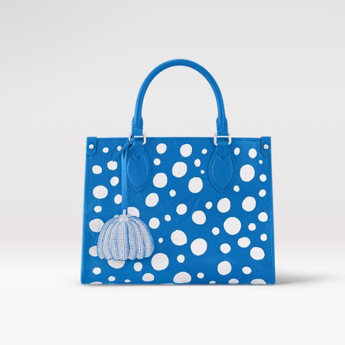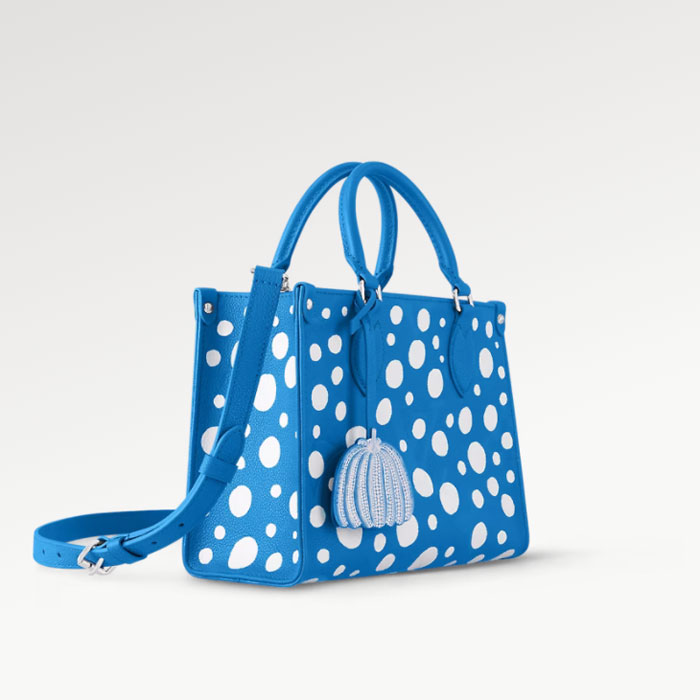 The “Infinity Dots” print gives the LVxYK OnTheGo PM a psychedelic look for the new Louis Vuitton x Yayoi Kusama collection. The acclaimed Japanese artist has been fascinated with dotted patterns since childhood, using them in her paintings and sculptures to convey a sense of infinity. For this compact, functional handbag, radiant white dots adorn bright blue Monogram Empreinte cowhide. And the pumpkin-shaped charm evokes another of Kusama’s visual signatures.