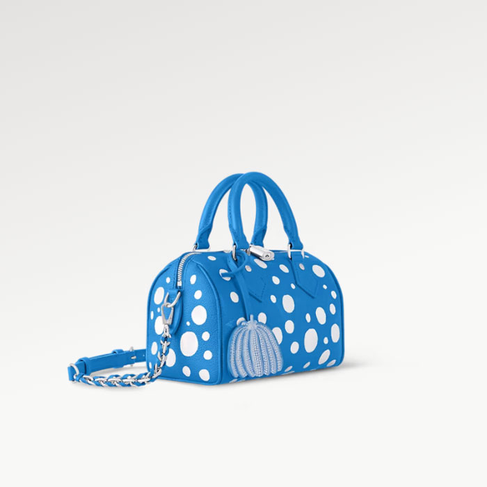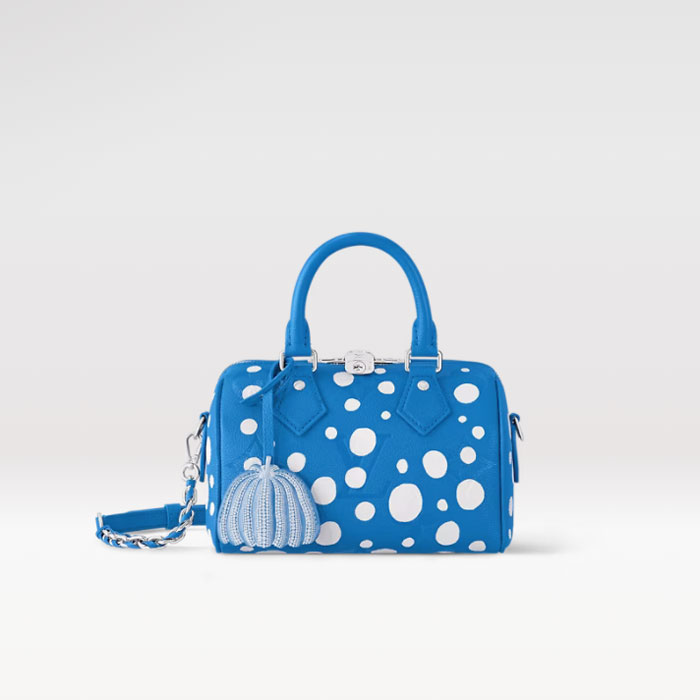 The LVxYK Speedy 20 gets an eye-popping new look for the second Louis Vuitton x Yayoi Kusama collaboration. This version in sumptuous light blue Monogram Empreinte cowhide is emblazoned with a constellation of radiant white dots. The venerated Japanese artist has made dotted patterns a unifying theme in her work, an evocation of eternity and infinity. And another of Kusama鈥檚 visual signatures inspired a fun extra touch: a pumpkin-shaped charm.