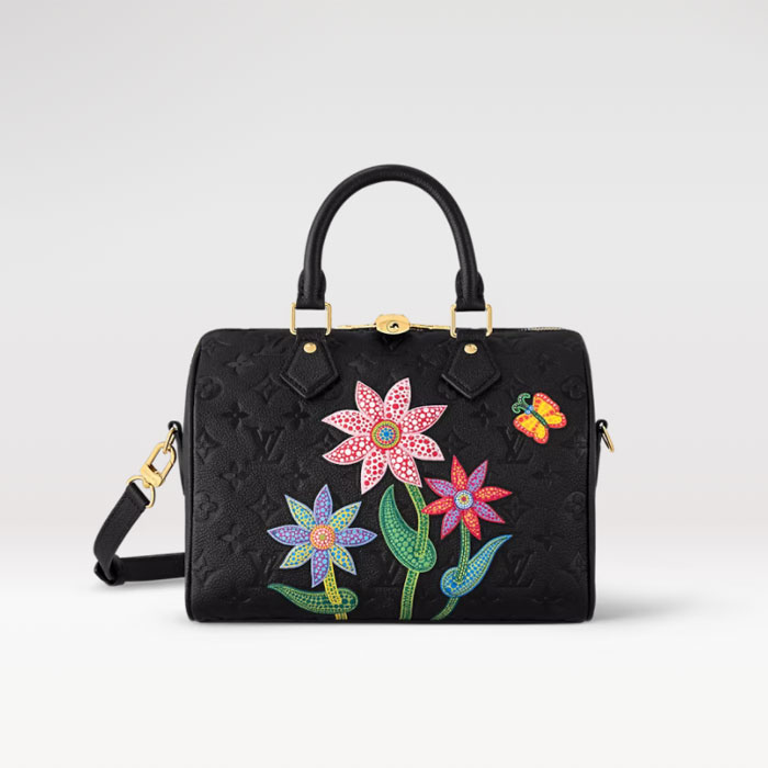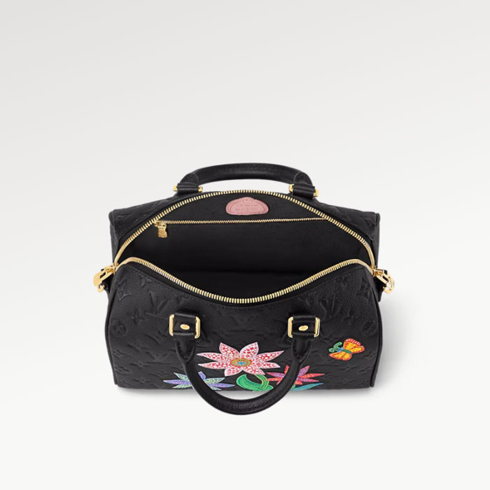 For the Louis Vuitton x Yayoi Kusama collection, the LVxYK Speedy Bandouli猫re 25 comes adorned with three colorful flowers and a butterfly. Flowers have been a key element in the artist鈥檚 life and work since her childhood in rural Japan, where her parents ran a plant nursery. Here they appear in leather marquetry on black Monogram Empreinte cowhide, giving this stylish bag a distinctively feminine crafted touch.