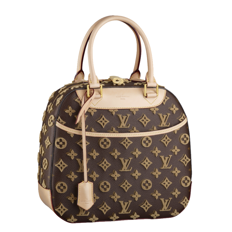Louis Vuitton reinterprets the classic Bowling bag through the traditional tufting technique,inspired from carpet making and developed for the Spring/Summer 2013 fashion show on leather goods.Contrasting textile thread is stitched on the Monogram Canvas to bring a touch of color to its iconic pattern.Tufting creates an innovative 3D effect and a velvet-soft finish that make this bag a fashionable and feminine companion.