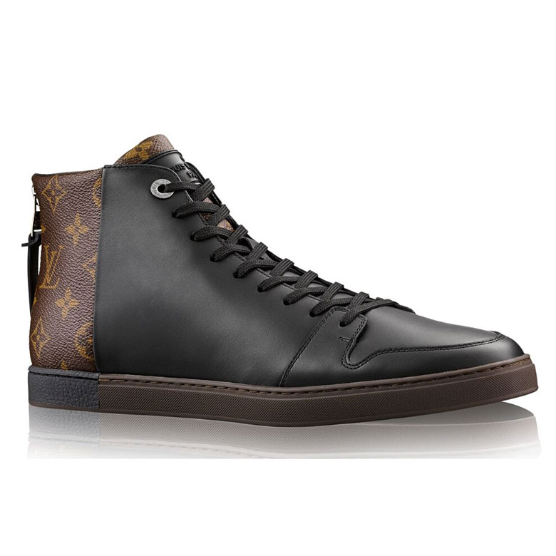 This original two-in-one sneaker boot contrasts plain calf leather at the front with Louis Vuitton's iconic Monogram canvas at the back - a combination echoed in the two-tone rubber sole.