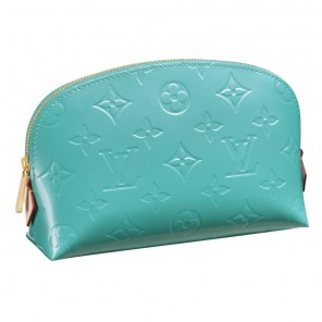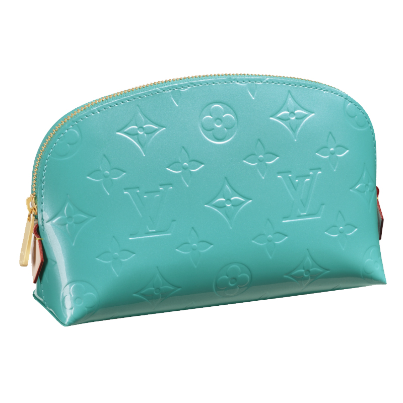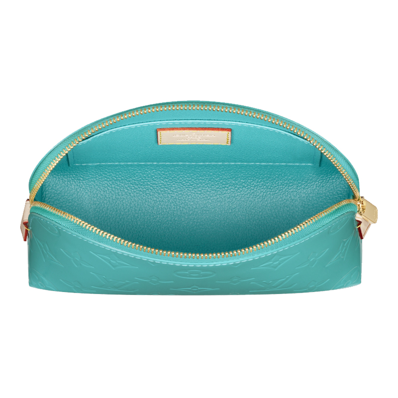 Discreetly embossed Monogram Vernis leather adds an exquisite touch of glamour to the Cosmetic Pouch. Its large zipped opening easily affords access to the contents inside.
