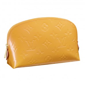 Discreetly embossed Monogram Vernis leather adds an exquisite touch of glamour to the Cosmetic Pouch. Its large zipped opening easily affords access to the contents inside.
