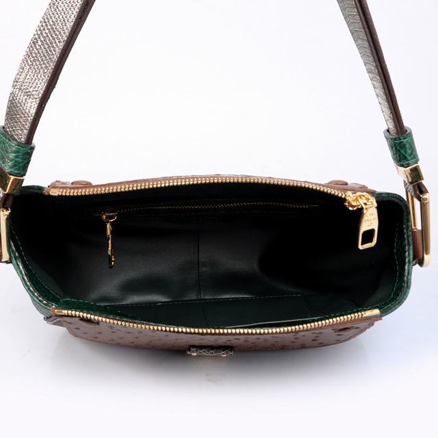 - Ostrich leather flaps and interior strap