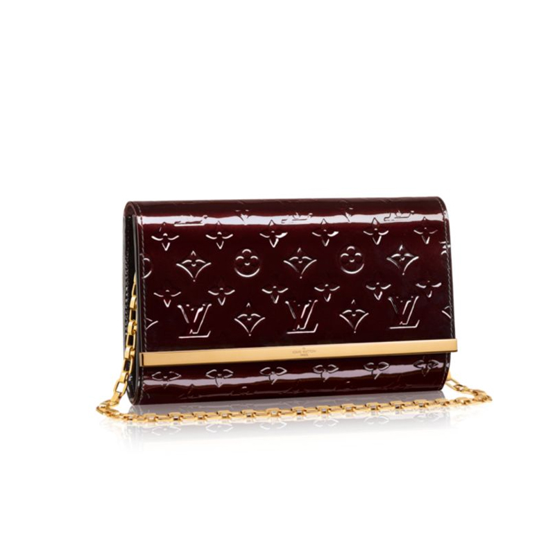 In rich colors and glossy Monogram Vernis leather, this fashionable clutch can be carried in different ways thanks to its golden chain and removable long leather strap. Its flap, equipped with a secure magnetic closure, is highlighted by a sophisticated Louis Vuitton-engraved metal plaque.