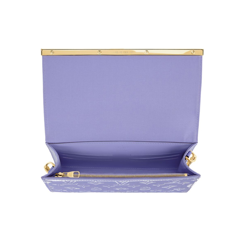 In rich colors and glossy Monogram Vernis leather, this fashionable clutch can be carried in different ways thanks to its golden chain and removable long leather strap. Its flap, equipped with a secure magnetic closure, is highlighted by a sophisticated Louis Vuitton-engraved metal plaque.