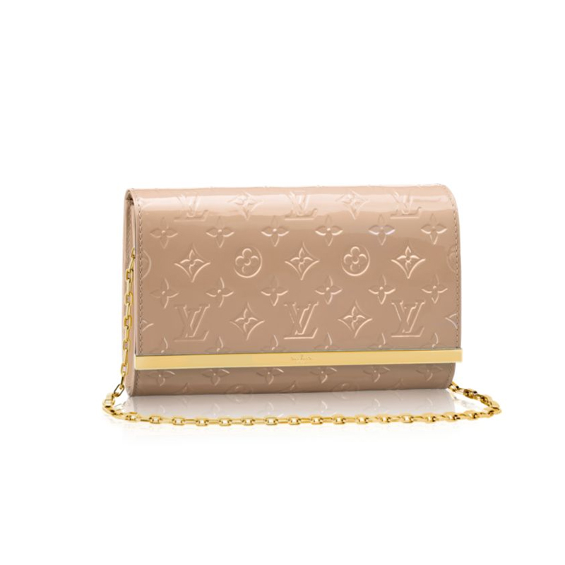 In rich colors and glossy Monogram Vernis leather, this fashionable clutch can be carried in different ways thanks to its golden chain and removable long leather strap. Its flap, equipped with a secure magnetic closure, is highlighted by a sophisticated Louis Vuitton-engraved metal plaque.
