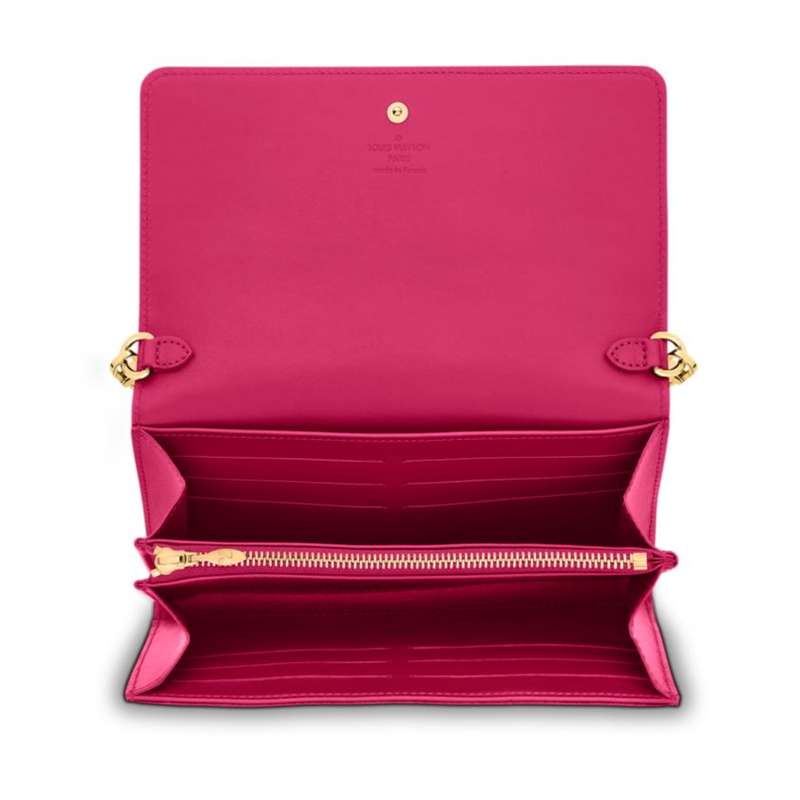 In rich colors and glossy Monogram Vernis leather, this spacious wallet can be transformed into a glamorous shoulder bag or clutch thanks to its removable golden chain. Its functional interior holds all everyday essentials.