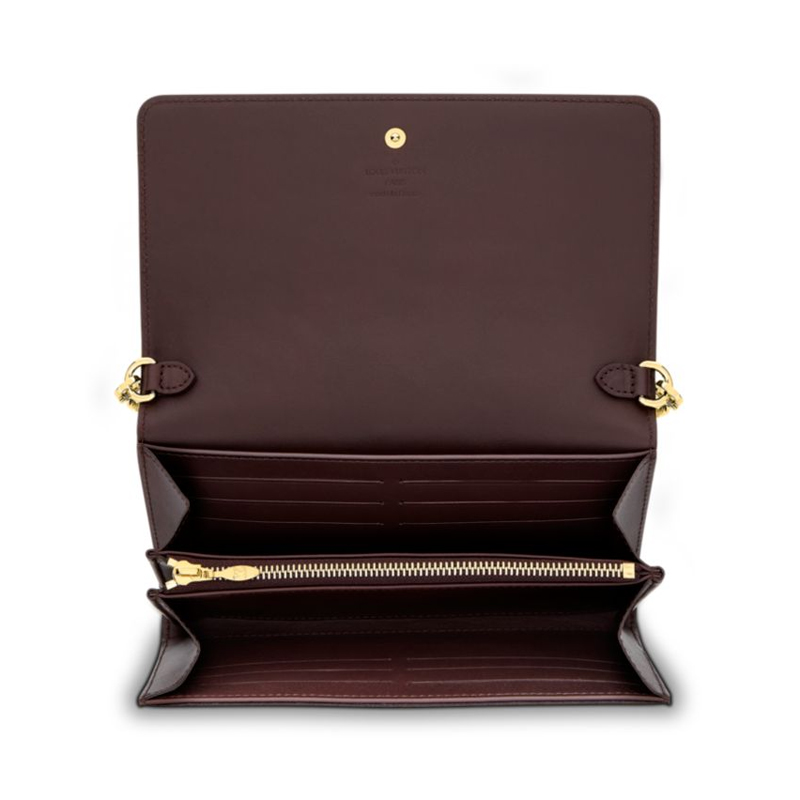 In rich colors and glossy Monogram Vernis leather, this spacious wallet can be transformed into a glamorous shoulder bag or clutch thanks to its removable golden chain. Its functional interior holds all everyday essentials.