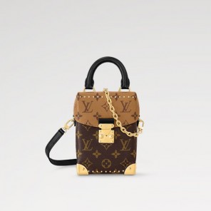 The Camera Box handbag combines all the Petite Malle’s signature details – S-lock, metallic corners, rivets, and a mix of Monogram and Monogram Reverse are all here – but on a modern shape. A thin gold-color chain brings a feminine touch to the bag while the pivoting top-handle adds a comfortable carry option.