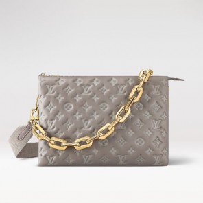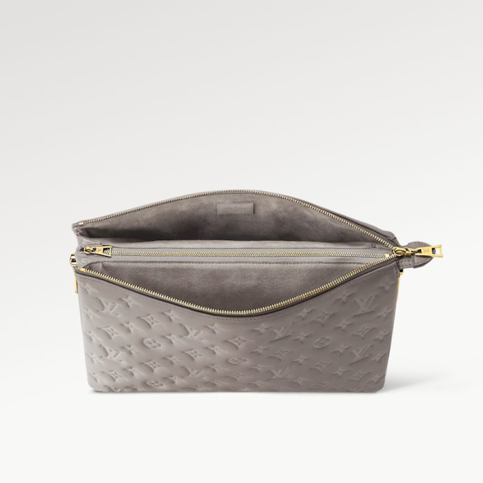 This season, the body-friendly and ultra-comfy Coussin MM handbag is made from Monogram-embossed puffy lambskin in a timeless grey hue with gold-color hardware. A wide textile strap enables comfortable all-day cross-body wear while the removable chunky chain allows under-arm and baguette carry. Inside, the Coussin features three separate compartments.