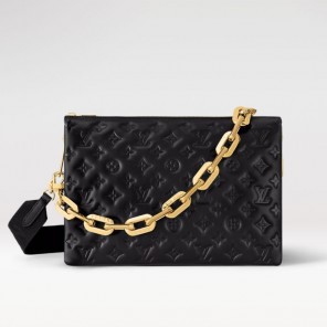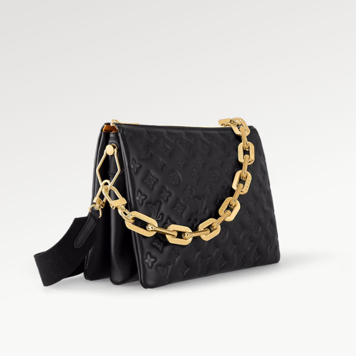 This season, the body-friendly and ultra-comfy Coussin MM handbag is made from Monogram-embossed puffy lambskin in a timeless grey hue with gold-color hardware. A wide textile strap enables comfortable all-day cross-body wear while the removable chunky chain allows under-arm and baguette carry. Inside, the Coussin features three separate compartments.