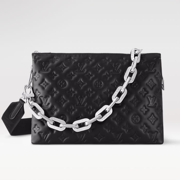 The Coussin PM handbag is crafted from soft, puffy lambskin embossed with tonal Monogram motifs. This model is fitted with a wide, adjustable textile strap for a casual carry, and a new LV shoulder chain: its silvery links create a stylish contrast with the chic black leather. Both strap and chain are removable, enhancing the versatility of this fashion-forward piece.