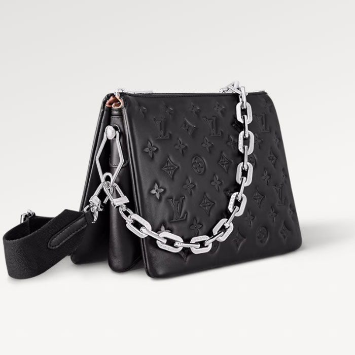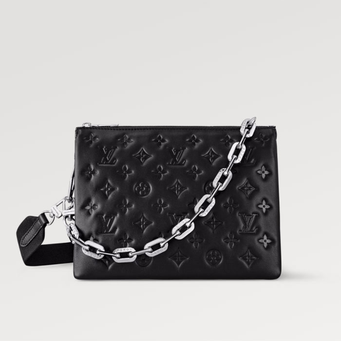 The Coussin PM handbag is crafted from soft, puffy lambskin embossed with tonal Monogram motifs. This model is fitted with a wide, adjustable textile strap for a casual carry, and a new LV shoulder chain: its silvery links create a stylish contrast with the chic black leather. Both strap and chain are removable, enhancing the versatility of this fashion-forward piece.