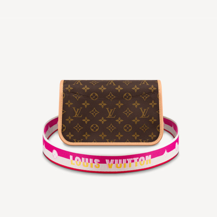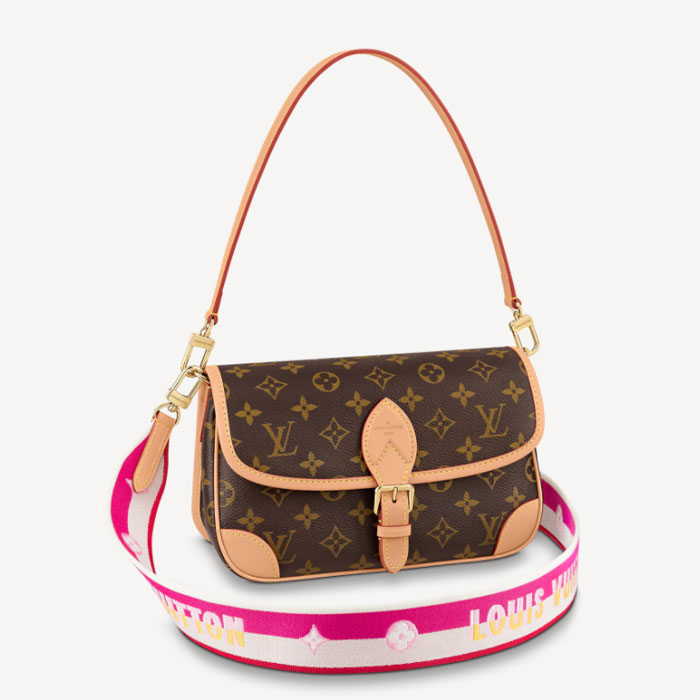 The Diane satchel in Monogram canvas revisits a classic model from the 90s, combining such vintage details as leather corners and an archival-inspired buckle with the modern functionality of smart pockets and a well-organized interior. The exclusive wide jacquard strap reverses from a bold Louis Vuitton signature to a subtle Monogram Flower motif.