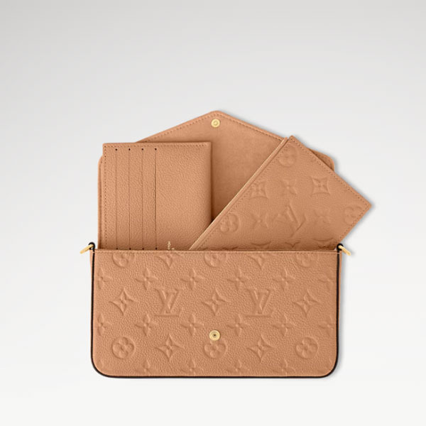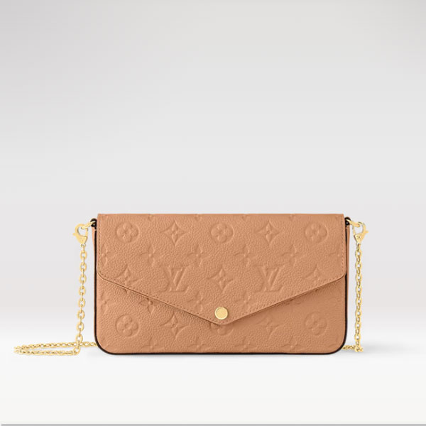 Crafted from Louis Vuitton’s emblematic Monogram Empreinte leather, the Félicie Pochette is both sophisticated and functional. It’s designed with two removable pockets – one of which is zipped, while the other features eight card slots. The elegant gold-toned chain offers multiple carry options and can also be removed to convert the style into a clutch.
