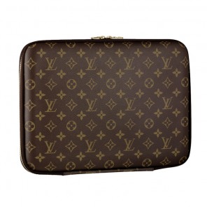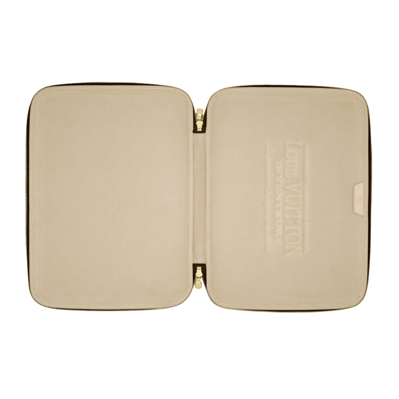 This larger, slim Computer sleeve, made from classic Monogram canvas, opens flat thanks to a double zipper. A protective foam-lined compartment is embossed with the Louis Vuitton inventeur signature.