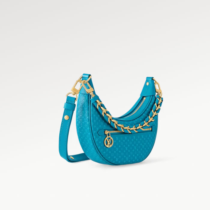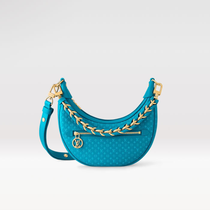 The Loop baguette handbag is fashioned from calfskin with a nano version of the Monogram embossed into the leather. The colored silk-screened LVs and Monogram Flowers contrast subtly with the base. The bag is accented with gold finish on the chain and the emblematic LV Circle zip pull.