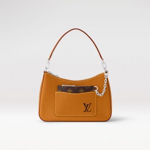 The Marelle handbag is fashioned from grained Epi leather with a detachable canvas pouch that sits in an outside pocket and is attached to the bag with a chain. The Marelle can be carried by hand, elbow or shoulder with its detachable top handle, or worn as a cross-body thanks to its removable and adjustable leather strap.