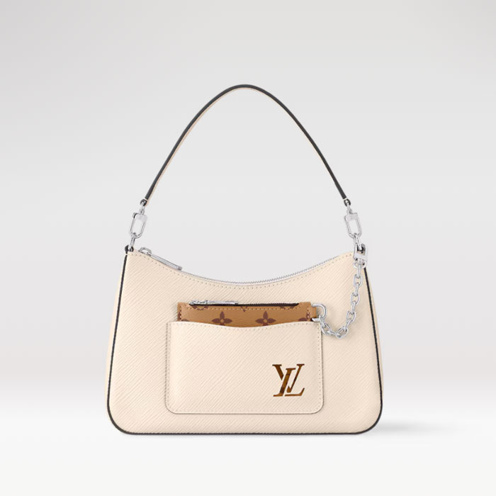 The Marelle handbag is fashioned from grained Epi leather with a detachable canvas pouch that sits in an outside pocket and is attached to the bag with a chain. The Marelle can be carried by hand, elbow or shoulder with its detachable top handle, or worn as a cross-body thanks to its removable and adjustable leather strap.