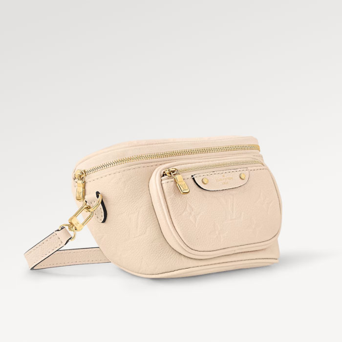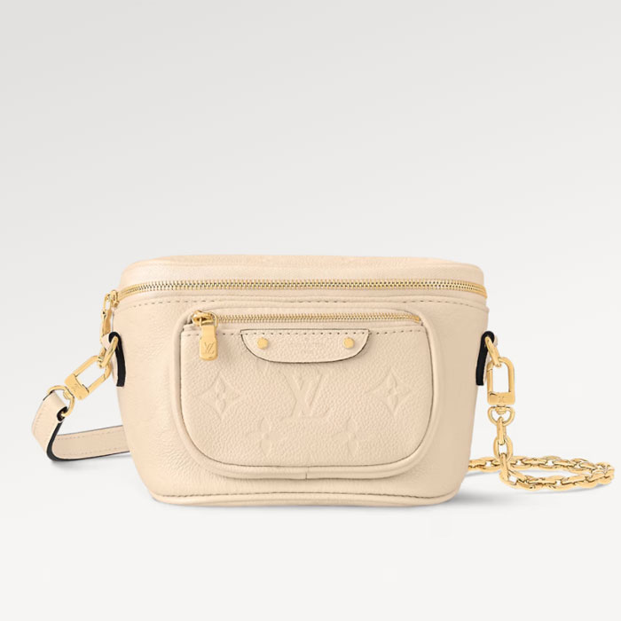 The Mini Bumbag is reinterpreted in supple, grained Monogram Empreinte leather, which is embossed with the Monogram pattern. This on-trend piece features a removable, adjustable strap and a removable, gold-tone chain for different looks and carry options. It has a zipped main compartment and a zipped front pocket with an embossed leather tag.