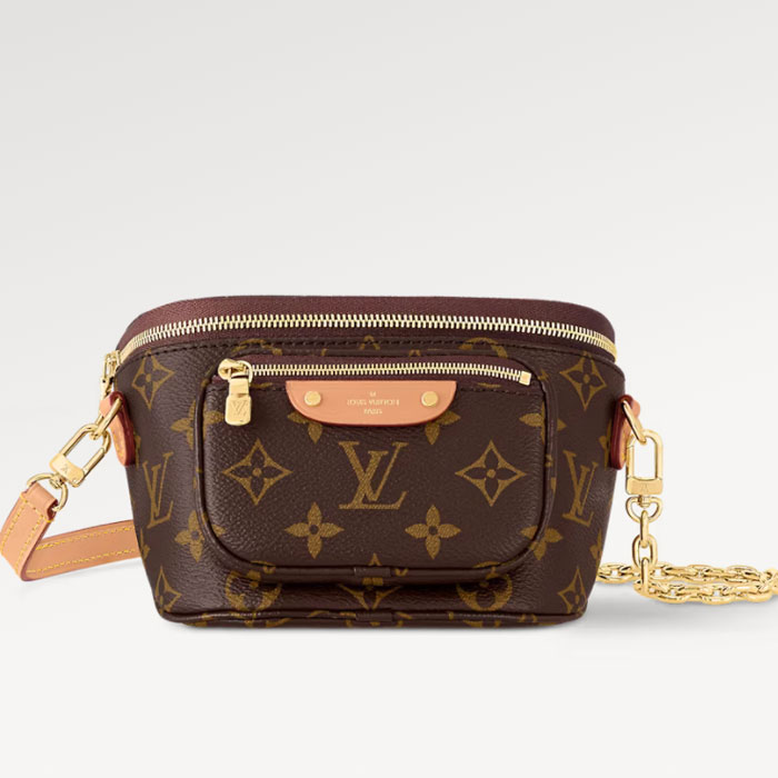 The Mini Bumbag in Monogram canvas is Louis Vuitton's feminine interpretation of the on-trend bumbag format. Designed for versatility, it features a removable, adjustable strap in the House's emblematic natural leather, as well as a removable gold-tone chain, which can be functional or decorative. The bag has a zipped main compartment and a zipped front pocket with an embossed leather tag.