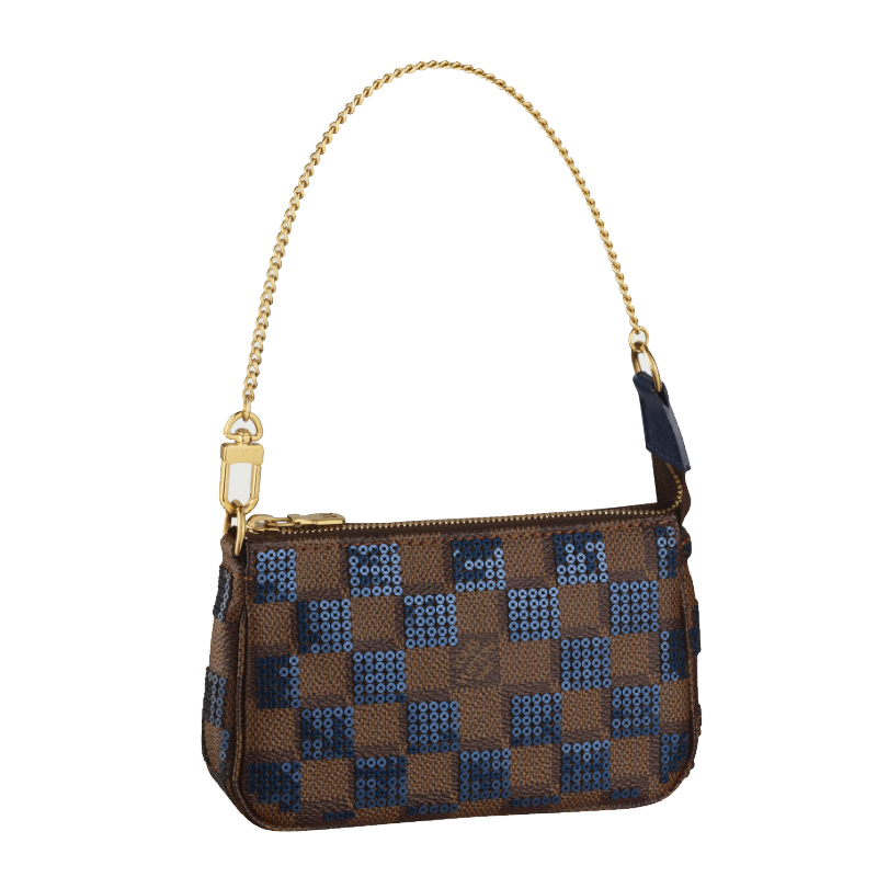 Inspired by the geometric spirit of Louis Vuitton's Spring/Summer 2013 fashion show, the essential Mini Pochette Accessoires in Damier canvas is reinterpreted as Damier Paillettes. Intricately embroidered with colored sequins and swinging from a golden chain handle, it becomes a sophisticated, glamorous accessory for evening.