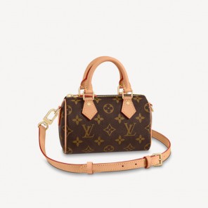 The Nano Speedy revamped in Monogram canvas is the perfect miniature version of Louis Vuitton's iconic Speedy bag, and the ideal way to carry essentials. This beautifully crafted design is complemented by aged natural cowhide leather and gold-tone hardware. In addition to its two handles, it has a removable, adjustable shoulder strap for different carry options.